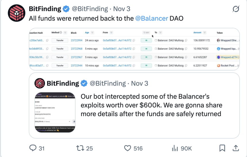 Balancer offered a 20% white hat bounty to ethical hackers and the perpetrator for the return of the stolen funds, but no one had claimed the bounty as of this writing.