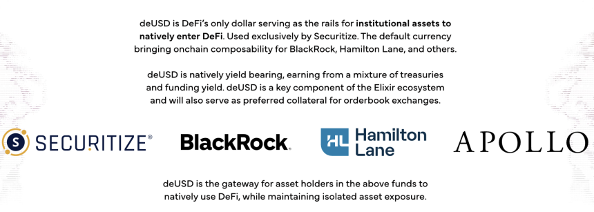 Elixirs website describes deUSD as “ the rails for institutional assets to natively enter DeFi,” saying the token is used exclusively by Securitize, and the “gateway for asset holders” in BlackRock, Hamilton Lane and Apollo funds.