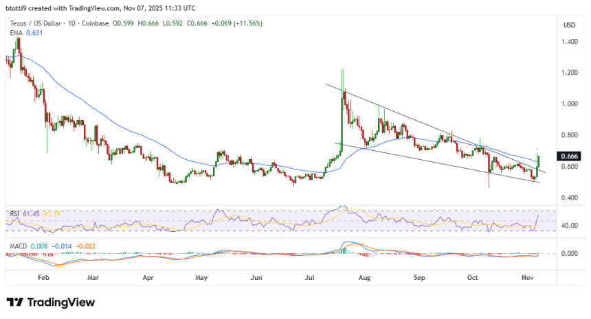 Tezos XTZ climbed more than 20% to reach a multi-week high of $0.69 during early trading sessions on November 7, 2025.