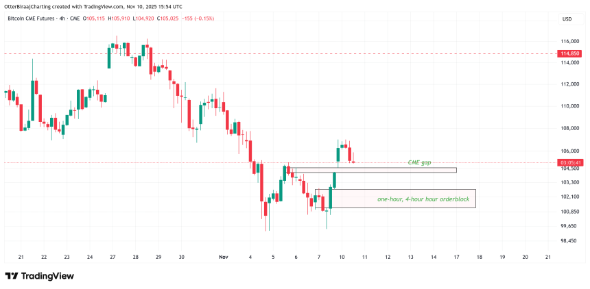 Additionally, a CME gap between $103,100 and $104,000 remains a key short-term risk. CME gaps occur when Bitcoin‘s weekend price movement creates a difference between Friday’s closing and Mondays opening price on the Chicago Mercantile Exchange, and these gaps often get “filled” as traders revisit these levels, suggesting BTC may briefly retrace before resuming its uptrend.