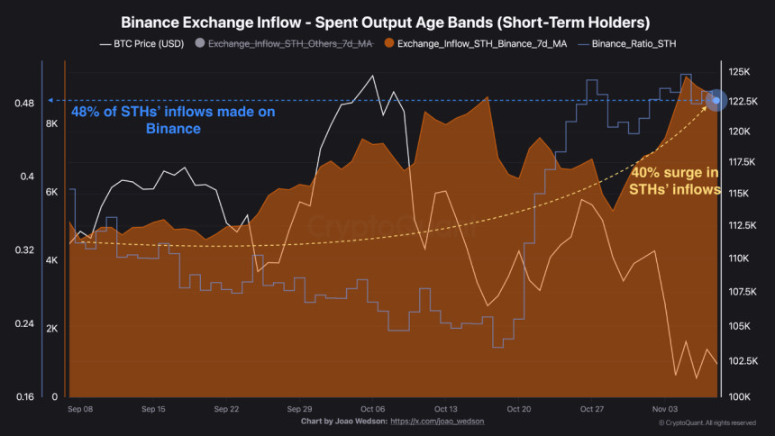 Conversely, crypto analyst Darkfost observed a sharp 40% rise in short-term holder (STH) inflows to Binance since September, up from 5,000 BTC to 8,700 BTC. With the realized price for STHs around $112,000, many remain underwater and are increasingly reactive to short-term volatility. This cohorts selling pressure often precedes mid-cycle shakeouts before broader bullish continuations, adding a layer of short-term instability.