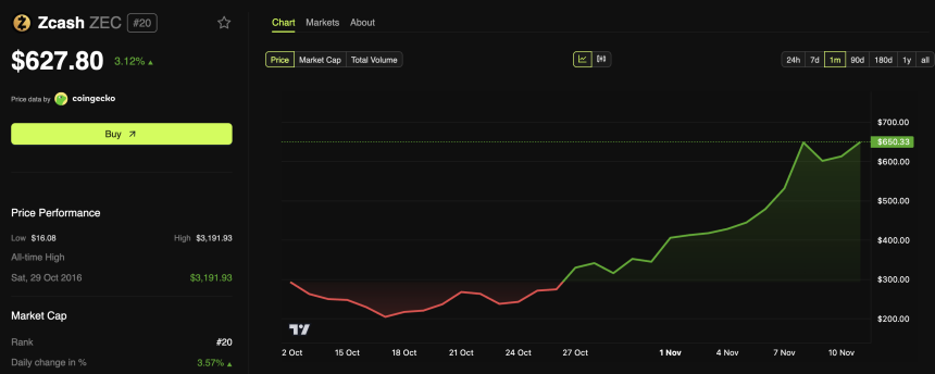 WikiBit 2025-11-11 02:03Zcash (ZEC) has experienced one of the strongest rallies lately, rising 790% since October and outpa