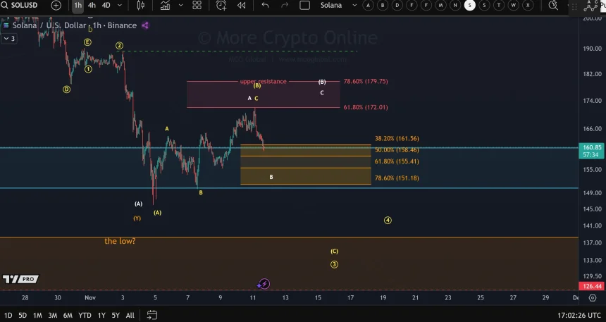 Meanwhile, Solana (SOL) trades at $158.33, marking a 4.94% daily drop but a 1.21% weekly gain. More Crypto Online analysis shows SOL is testing a crucial support zone between $158 and $155, defined by Fibonacci retracements. A rebound above $161 could drive a move toward $172–$179. However, a dip below $151 might signal further decline toward $145.