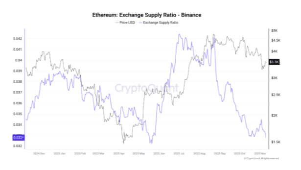 CryptoQuant reveals that the amount of Ethereum on the leading crypto exchange by volume, Binance, has plummeted continuously in the past few sessions, now at levels last seen in May this year.