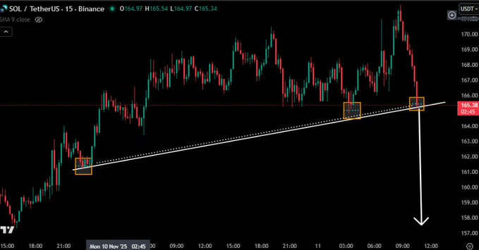 Crypto analyst @LordOfAlts highlights a visible ascending trendline that SOL has tested several times, confirming robust support at the $163 – $165 region.