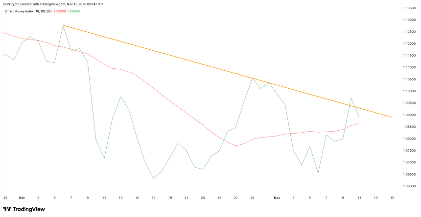 The Smart Money Index (SMI) — which follows early investor behavior — also supports that view. The SMI‘s green line still sits slightly above the signal line, meaning activity and money flow haven’t vanished. The SMI even managed to break its descending trendline on November 10. Yet, it failed to trigger a strong HBAR price bounce.