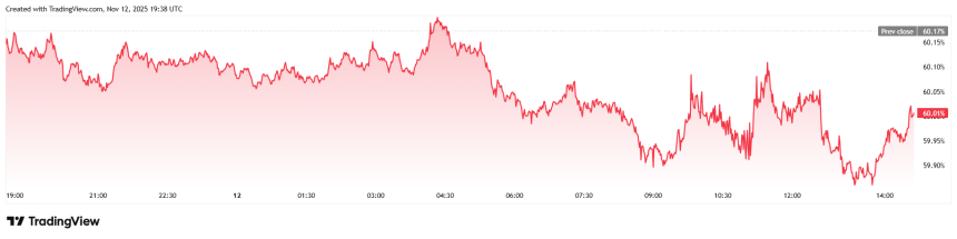 Twenty-four-hour trading volume was lower by 12.73% at $62.77 billion. Market capitalization fell to $2.01 trillion and bitcoin dominance eased 0.28% since yesterday to reach 60%.