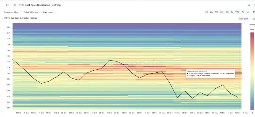 The cost-basis heatmap shows where the largest pockets of BTC supply sit. These pockets often block upside moves because many holders react when the price returns to their entry levels. One of the strongest clusters now sits between $109,895 and $110,192, backed by 117,078 BTC. Other strong BTC clusters exist before that, but this zone has the deepest of colors, especially in the near term.