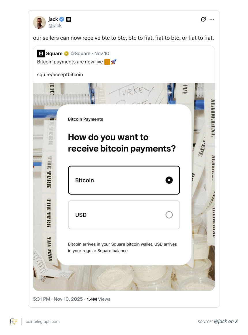 Block, a payments infrastructure company led by Jack Dorsey, has introduced a Bitcoin payments platform through Square. The rollout gives Squares US merchant network, which includes roughly 4 million businesses, the ability to accept Bitcoin (BTC), with availability expanding in phases.
