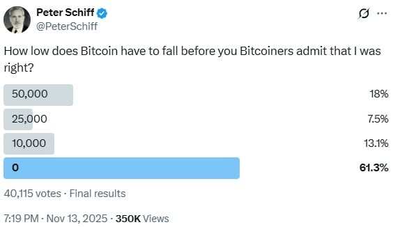 The gold bug also shared results from a Nov. 13 poll on X in which he asked: “How low does bitcoin have to fall before you bitcoiners admit that I was right?” The poll drew 40,115 votes, with 18% selecting $50,000, 7.5% choosing $25,000, 13.1% opting for $10,000, and 61.3% picking $0.