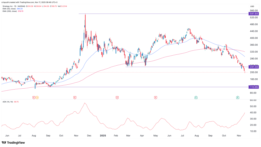 Strategy also formed a death cross pattern in October. The Average Directional Index (ADX) has soared to 40, a sign that the trend is strengthening.