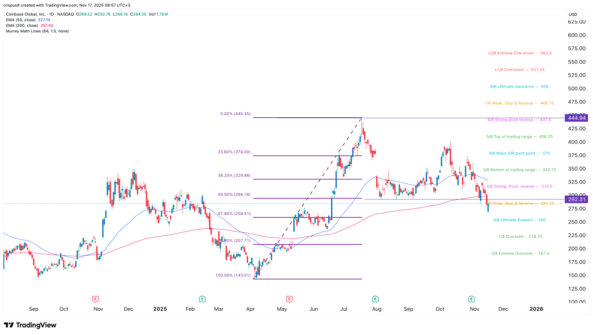 Therefore, the most likely Coinbase stock price forecast is bearish, with the next target being at $250. This target is along the ultimate support level of the Murrey Math Lines.