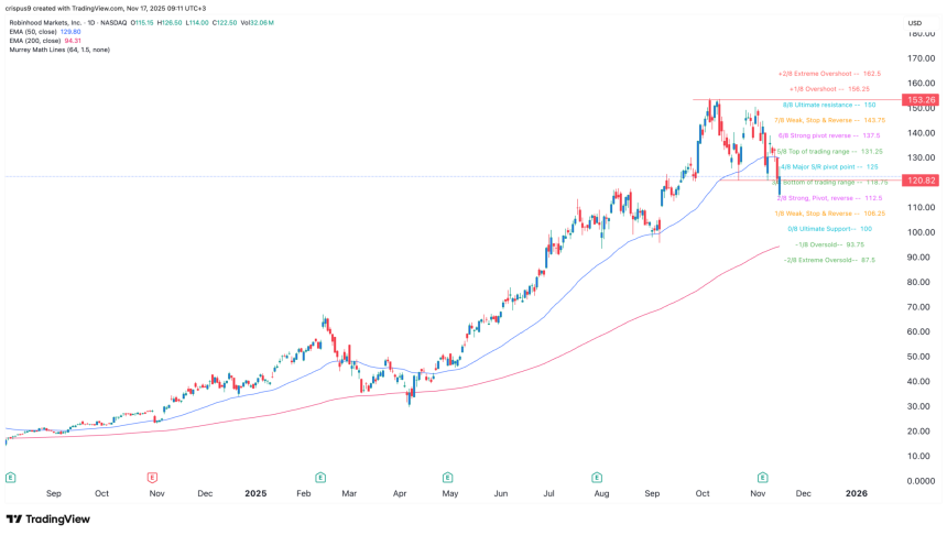 Robinhood stock has moved below the 50-day moving average and the Major S/R pivot point of the Murrey Math Lines. Therefore, the most likely HOOD stock price forecast is bearish, with the next point to watch being at $100, the ultimate support. On the flip side, a move above the Major S/R pivot point at $125 will invalidate the bearish outlook.