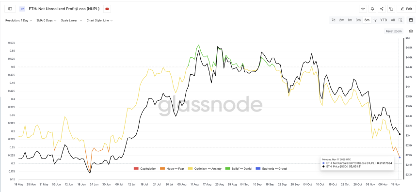 After that, selling returned, and ETH is now trading lower. If NUPL follows the June path and drops to the same reset zone near 0.17, the price projection lands near $2,470, per the 20.7% correction pathway mentioned earlier. Do note that the NUPL has already hit the 0.21 levels as of November 16, heading down aggressively.