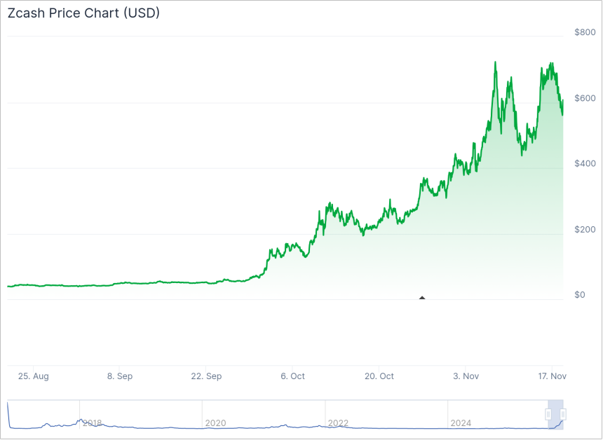 Meanwhile, ZEC is down over 10% on the day, trading around $600, per The Defiant‘s price tracking page. Even with the correction, the token is still up more than 1,400% over the past three months, after a sharp, extended rally that started in late September of this year, and pushed the price from $55 to over $720, a level ZEC holders haven’t seen since 2018.