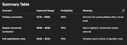 ChatGPTs primary scenario projects Bitcoin correcting to $72,000 and $85,000, a range it assigns a 65% probability. The AI noted this zone sits just below the $90,000 liquidity pocket and matches past mid-cycle pullbacks where buyers typically return, effectively a “normal correction zone” following a strong local peak.