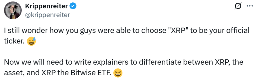 X user Krippenreiter, a self-proclaimed technician and DeFi educator, asked how exactly they “were able to choose XRP to be your official ticker. Now we will need to write explainers to differentiate between XRP, the asset, an XRP the Bitwise ETF.”
