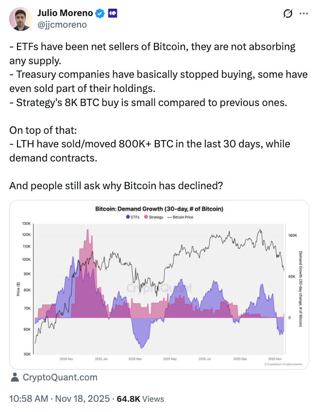 “Treasury companies have basically stopped buying, some have even sold part of their holdings,” Moreno observed, referring to companies like Metaplanet, whose most recent BTC purchase was in September.