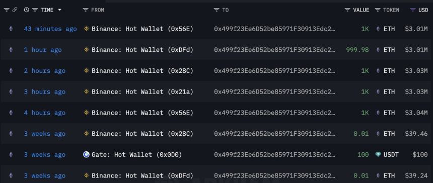 Meanwhile, the activity is not limited to Bitcoin. A separate report from Lookonchain revealed that a newly created wallet tagged 0x499f pulled 5,000 ETH from Binance through five transactions completed within hours. The acquired Ethereum is valued at about $15.04 million. The wallet now contains only 5,000 ETH and 100 USDC.