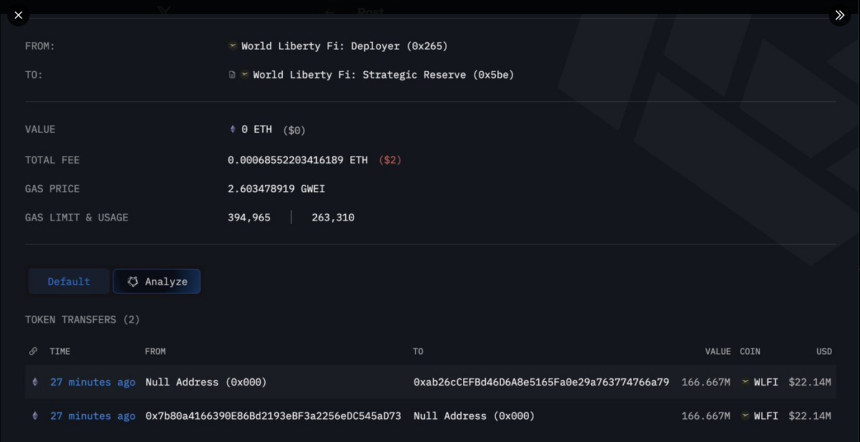 World Liberty Fi executed an emergency function burning 166.667M $WLFI ($22.14M) from compromised address, reallocating to a recovery address.