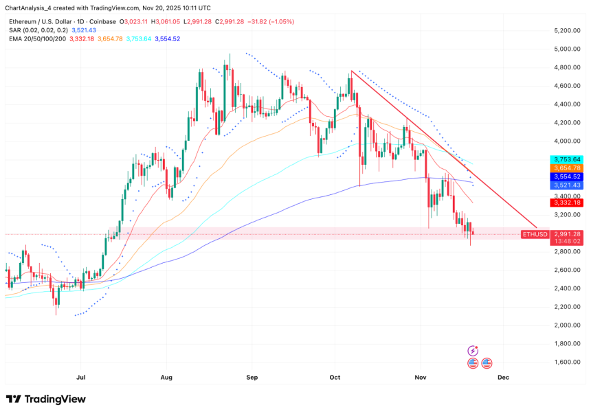 WikiBit 2025-11-20 21:00Ethereum price today trades near $2,991, slipping deeper below the long descending trendline that ha