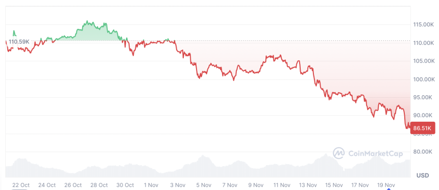Bitcoin has been in a downtrend almost ever since setting a new all-time high of $125,100 on Oct. 5, dropping to as low as $88,000 on Wednesday. Despite posting a brief recovery, the price fell even lower to $86,870 at the time of publication, according to CoinMarketCap.