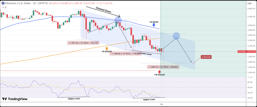 Since then, the digital asset has been caught within a Channel Down. This Channel Down is what triggered the double-digit decline that has been recorded for the altcoin since then. As the crypto analyst explains, the Ethereum price has seen a 27.50% decline on both of its bearish legs since this trend was established.