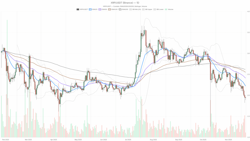 XRPUSDThas slipped into a fragile phase where longer-term sellers still dominate, yet short-term price action hints at the first attempts at stabilization.