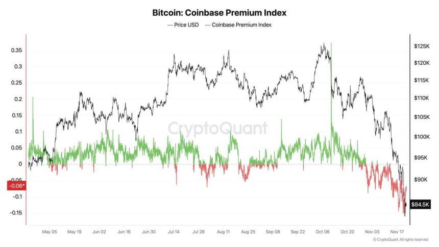 The Coinbase Bitcoin Premium Index has remained negative for 21 consecutive days, the longest streak in the current cycle. Data from Coinglass shows the index has stayed below zero since early November, mirroring Bitcoins drop from near $120,000 to around $84,000.