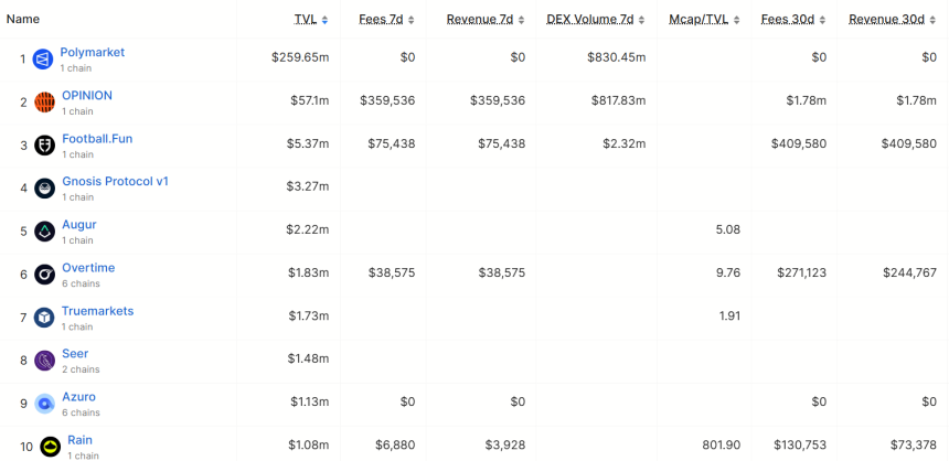 Rain is the 10th largest prediction market in the blockchain industry, with $1 million in total value locked (TVL) and $73,378 in monthly revenue generated during the past 30 days, according to blockchain data aggregator DefiLlama.