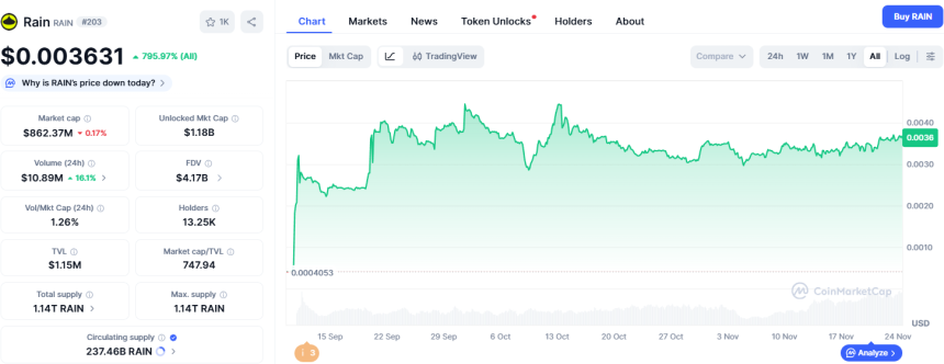 Launched on Sept. 9, the Rain token is the 203rd largest with a $862 million market capitalization. The tokens price has risen by over 9% during the past month and by about 795% since its launch, according to CoinMarketCap.