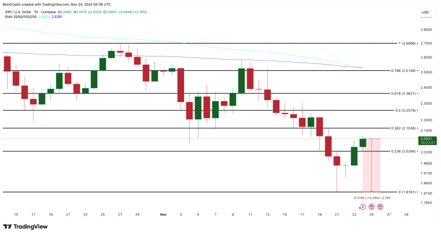 Even with a mild recovery, the XRP price still trades under the major moving averages. The 100-day exponential moving average (EMA) and the 200-day EMA are both angled down, and the 100-day is now about to cross below the 200-day.