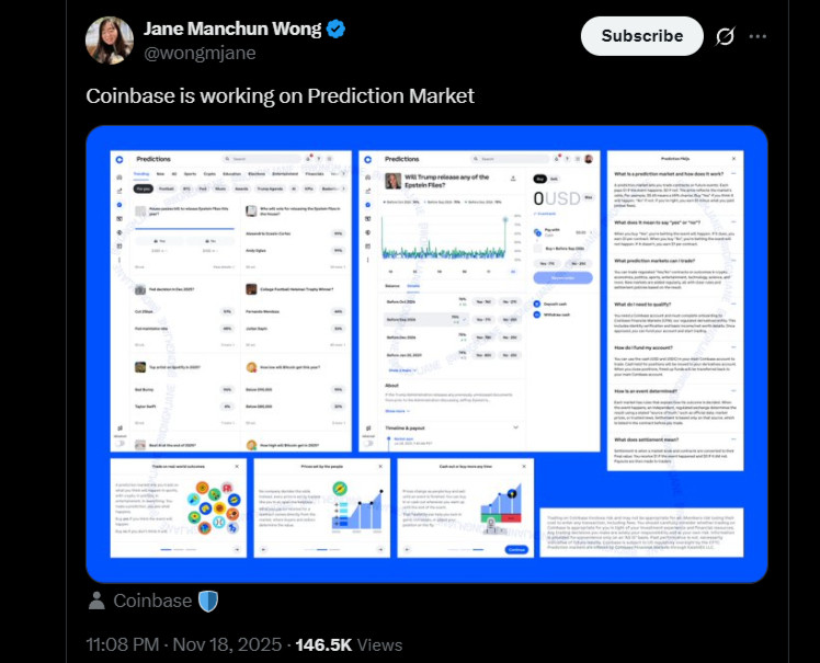 Coinbase is, reportedly, developing a prediction markets platform that will use Kalshi's regulated infrastructure, according to screenshots uncovered by tech researcher Jane Manchun Wong. The images show a fully designed interface branded with Coinbase's logo and indicate the platform will be operated through Coinbase Financial Markets, the exchange's derivatives division.