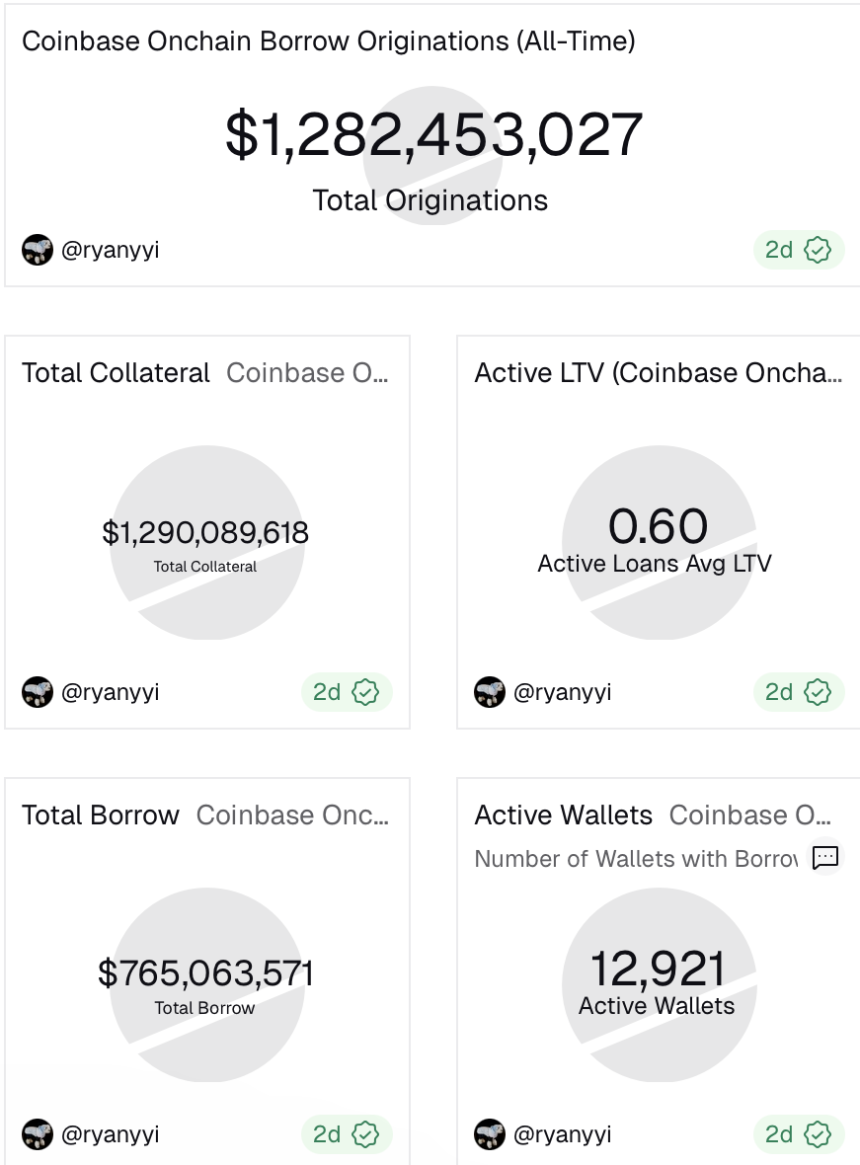 Coinbases onchain lending markets have handled about $1.28 billion in loan originations since launching earlier this year, according to Dune data.