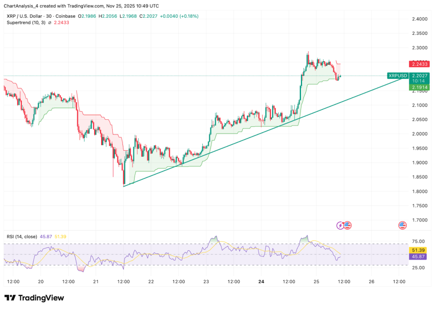 WikiBit 2025-11-25 23:03XRP price today trades near $2.20 after rebounding from the $1.88 demand zone, a level that has acte