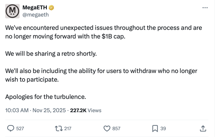 MegaETH ultimately froze deposits at $500 million and scrapped plans to expand the raise to $1 billion. A retro and a withdrawal option will be released shortly.