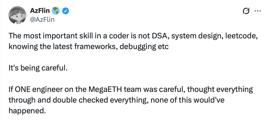 Some users praised MegaETHs transparency in explaining what happened, but others were far more critical. AzFlin, a developer and DAO founder, argued that the mistakes could have been prevented if engineers had been more careful.