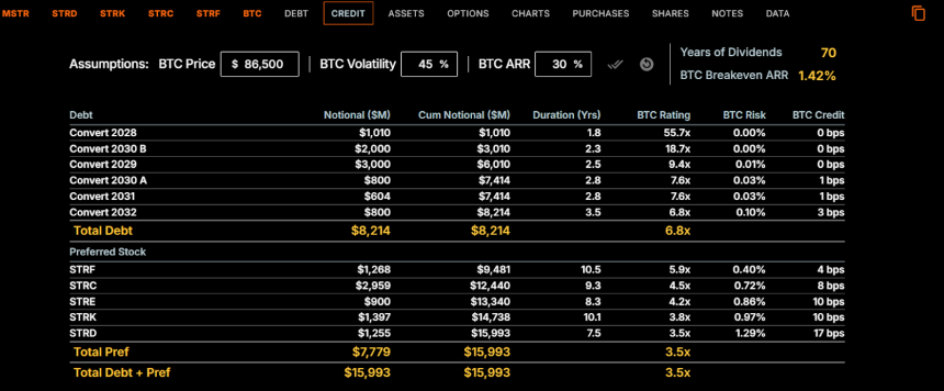 Strategy, the world‘s largest corporate Bitcoin (BTC) holder, has rolled out a new credit rating dashboard based on the company’s preferred stock notional value, and claims to have another 70 years‘ worth of dividend payment runway to service its debt, even if Bitcoin’s price remains flat.