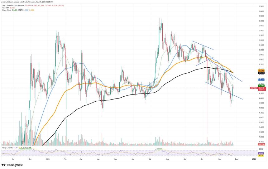 The rebound began precisely at the lower edge of XRPs declining channel, where buyers intervened forcefully enough to produce the biggest green candle since early November. The move restored short-term momentum and temporarily halted the downtrend by pushing the price directly toward the mid-channel region.