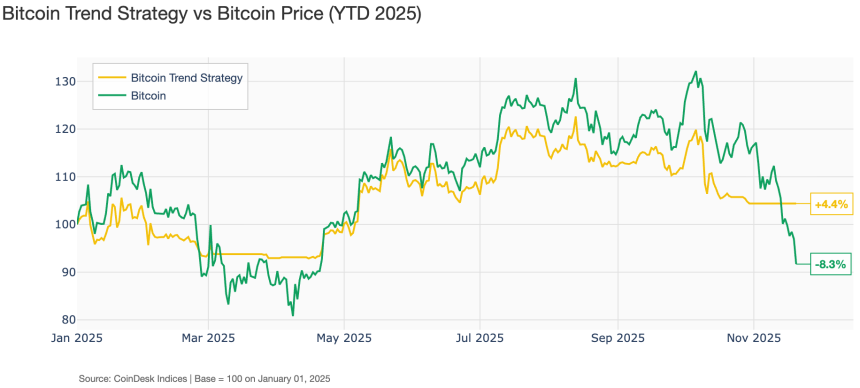 Speaking of trend, it is turning out to be a savior of 2025 performance. Our Bitcoin Trend Indicator (BTI), launched in March 2023, uses a quartet of moving average crossover signals to indicate the presence and strength of trend in the price of bitcoin. It has indicated “Significant Downtrend” for 24 days. Our clients have implemented several strategies based on BTI to allocate to — and away — from bitcoin. The YTD performance of one of those appears below.