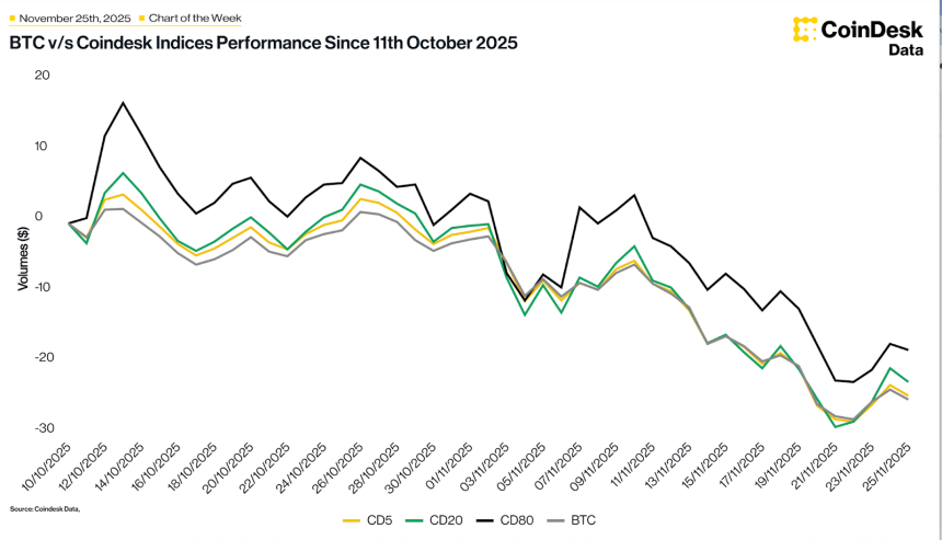Despite the overall downtrend post the major October 10 drop, altcoins - proxied by the CoinDesk 80 Index (CD80) - have mostly performed in line with, or even better than, BTC, with market benchmarks CoinDesk 5 Index (CD5) and CoinDesk 20 Index (CD20) showing relative outperformance. This is surprising because altcoins usually exhibit higher beta during a market drop, suggesting that the recent selling pressure may be more BTC-centric, or that altcoin selling has already been significantly exhausted.