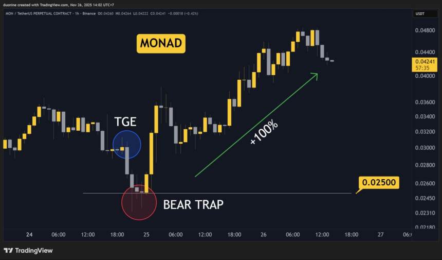 Within hours, however, MON rebounded sharply with a 50% price surge, catching many sellers off-guard, in what seems to be a classic bear trap.