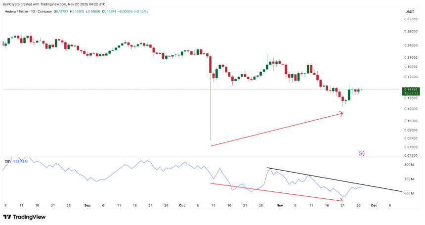 On-Balance Volume (OBV), which tracks whether real buying volume supports a move, still shows a bearish divergence. Between October 10 and November 21, the HBAR price formed a higher low while OBV made a lower low.