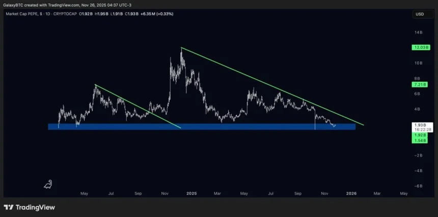 Meanwhile, PEPEs 1-day market-cap chart shows months of compression under a steady descending trendline drawn from the 2025 peak into mid-2026. The slope highlights a series of lower highs. This indicates that each recovery attempt since early 2025 has met overhead supply before pushing higher.