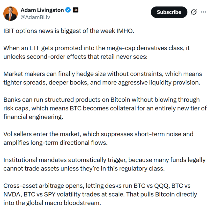 Liu said this current push from the Nasdaq to “super-size IBIT option limits shows Bitcoin markets breaking out of their training wheels.”
