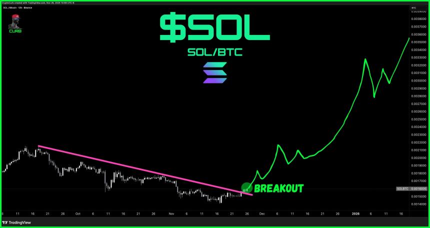 Elsewhere, with Solana finally recovering, a market watcher account, curb.sol, points to a breakout on the SOL/BTC pair. His chart on X shows the ratio pushing above a multi-month descending trendline, suggesting that Solana may be starting to outperform Bitcoin after an extended period of relative weakness. The chart points to a potential pump in the SOL/BTC pair toward roughly the 0.0035 to 0.0036 BTC per SOL area.