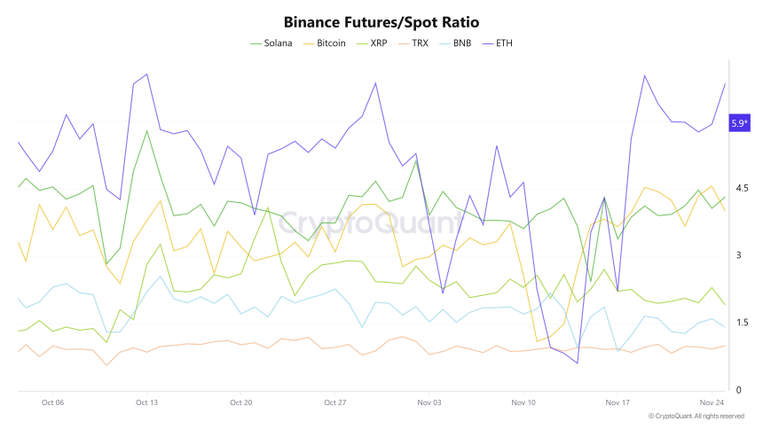 Recent data from CryptoQuant indicated Ethers futures-to-spot ratio on Binance had risen sharply from 5 to 6.84, its highest level in Q4. This acceleration marked a decisive rotation in market behavior, where traders increasingly prefer leveraged exposure over spot accumulation.