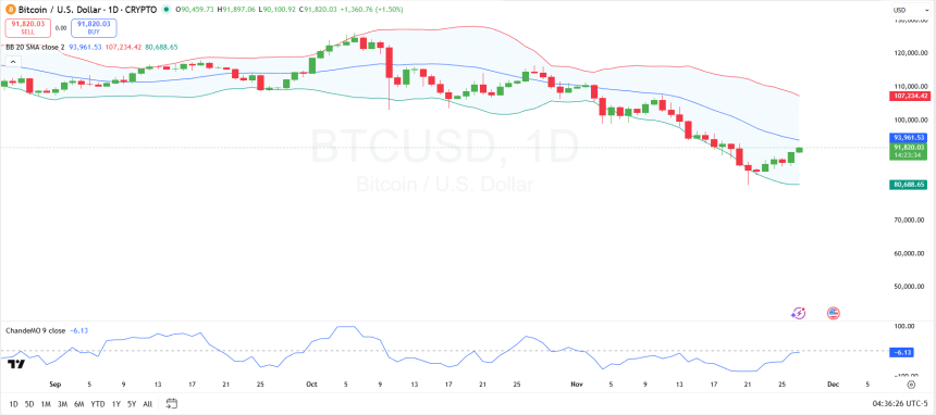 Looking at a daily chart from TradingView, Bitcoins price action is starting to normalize after a sharp slide along the lower Bollinger Band. Notably, candles have bounced from the recent lows near the lower band, currently located around $80,680 and are now pushing back toward the 20-day simple moving average near $93,958.