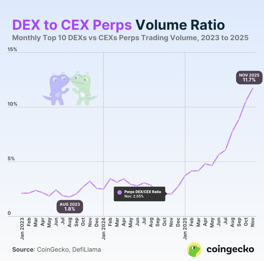 The DEX-to-CEX perpetuals ratio jumped from 2.05% in November 2024 to 11.7% this month, its strongest reading yet. When more traders choose on-chain perpetuals over exchange-based ones, it suggests confidence in DEX systems is rising.