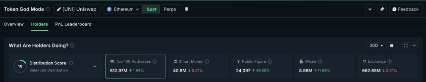 Uniswap (UNI) is down 3.4% in 30 days, but mega-whales increased holdings by 11.66%. Top 100 addresses now hold 8.98 million UNI, showing strong accumulation while exchanges continue to lose supply.